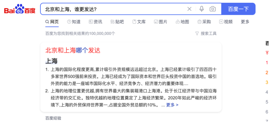 其实现在的百度搜索也在渐进地进化,生成式搜索早已初阶实现并应用。百度的搜索结果页很早之前就已经实现了简单的搜索信息整合,比如在经典的“北京和上海,谁更发达?”的这类经典问题下,搜索引擎会根据搜索结果进行直接的数据对比,甚至是计算,给出直接的答案。