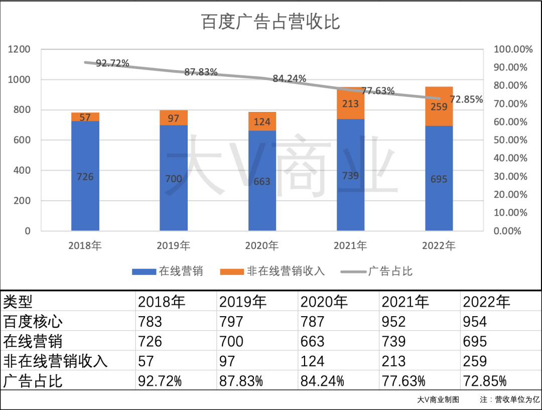 百度广告占营收的比例也在逐年下降,从2018年的92.7%降低到2022年的72.8%。
