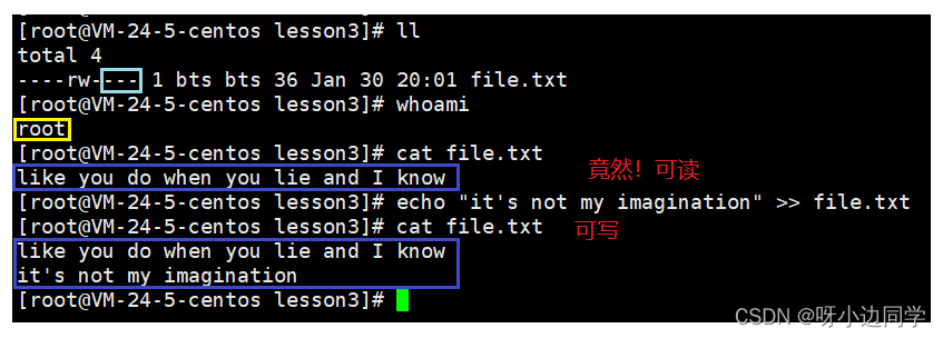 - 此时root作为这个文件的other,即便不具有读写属性,却竟然还能读和写。