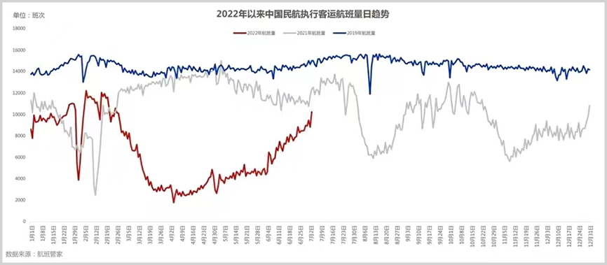 进入7月份,民航单日航班量持续保持在10000班以上,其中7月10日超过了12000班,比4月份的低点3000班增长了三倍。