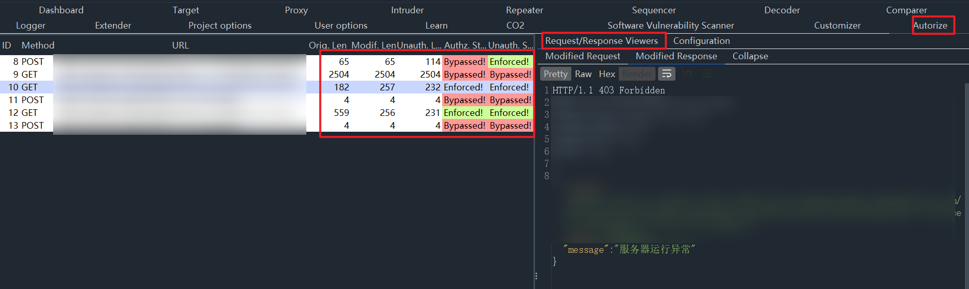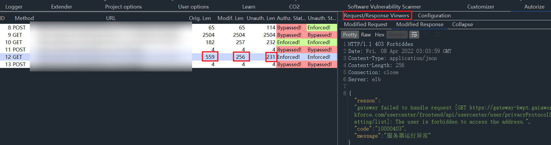 3 在burp的代理浏览器,以高权限用户访问页面,此时插件左边会获取到请求
