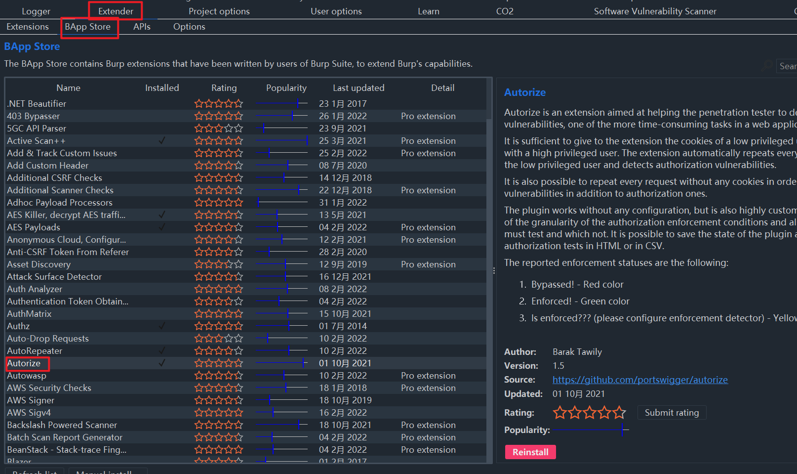 Autorize 是一个旨在帮助渗透测试人员检测授权漏洞的扩展,这是 Web 应用程序渗透测试中比较耗时的任务之一。