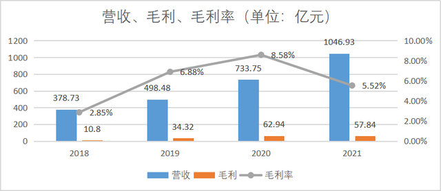 上市第一年,京东物流的营收突破了千亿,同比20年增长42.68%,四年营收CAGR(年复合增长)达到了40.34%。毛利21年底录得57.84亿,同比20年下降8.1%,四年毛利CAGR为39.05%。保持了非常高的增速。毛利率在20年达到8.58%后,21年底回落至5.52%。从净利润来看,2021年同期亏损幅度大幅增加,亏损156.61亿元。