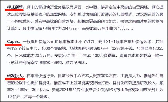 零担快运行业,顺丰快运已经超越德邦、安能、壹米滴答等原生玩家,成为收入和货运量的行业第一。顺丰快运能够弯道超车,得益于双网运营的模式创新,不计成本的资本支出,以及超出同行的研发投入。