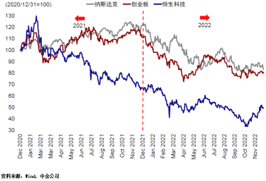 截止12月23日,恒生指数今年以来跌幅为16.26%,恒生科技指数跌幅为27.27%,二者自去年2月高点起算,本轮下跌已超20个月;纳斯达克指数跌幅为32.90%,自去年11月高点算起,本轮下跌已达14个月。