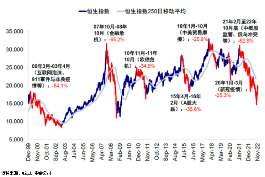 综合来看,恒指本轮最大跌幅52.8%,纳指本轮最大跌幅也达到38%,仅次于2008年的金融危机及2000年互联网泡沫危机。