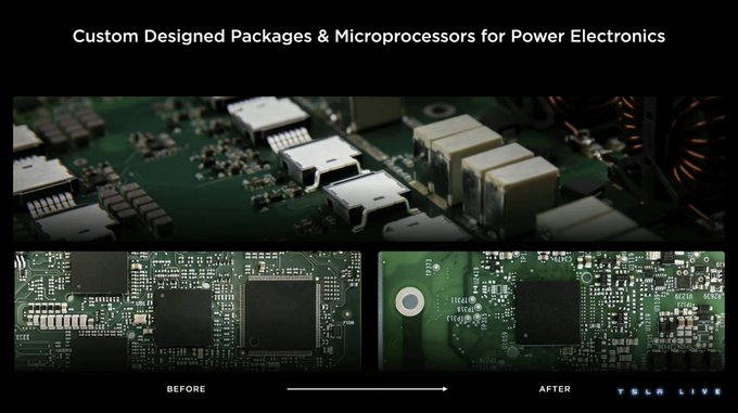 此外,特斯拉已自主设计了微处理器,并改良了动力系统的电子器件部分。特斯拉的微处理器较此前成本降低了 50%,并且只用一个芯片就能完成工作,效率较此前提升了4倍。