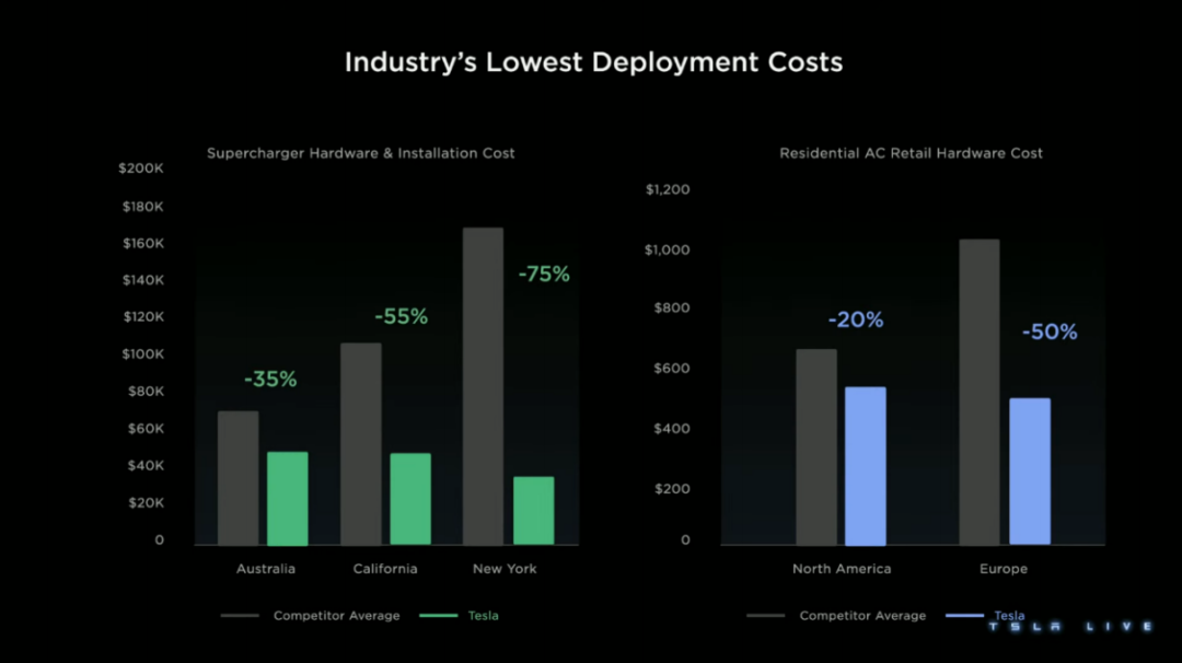 家庭场景之外,特斯拉的充电网络还蔓延到了公路上。Tinucci表示,特斯拉花了10年时间来建设自己的道路充电点基础设施,能用比同行低20%~70%的部署成本,建设出庞大的充电网络。Tinucci进一步解释,这主要得益于特斯拉的超级充电硬件与实际安装过程中的调度部署能力。