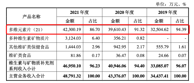 2019年至2021年,民生健康的主营业务收入分别为3.44亿、4.34亿、以及4.88亿。其中,21金维他贡献的销售收入分别为3.25亿、3.96亿和4.23亿,占当期主营业务收入的比重分别为 94.39%、91.32%和86.70%。