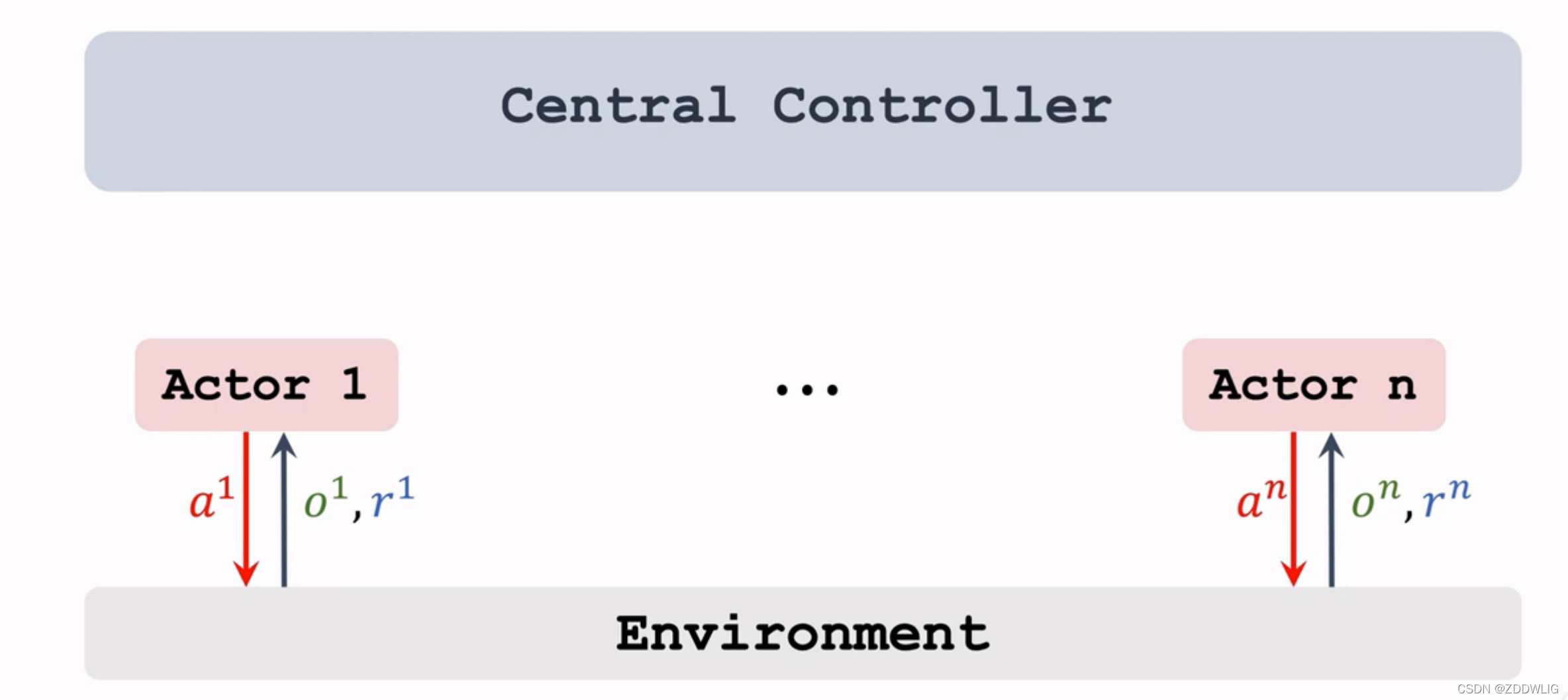 中心化训练去中心化执行(Centralized training,decentralized execution),这种方法就是为了解决完全中心化训练缓慢的问题,它只在中心处理器设置 个策略函数,第