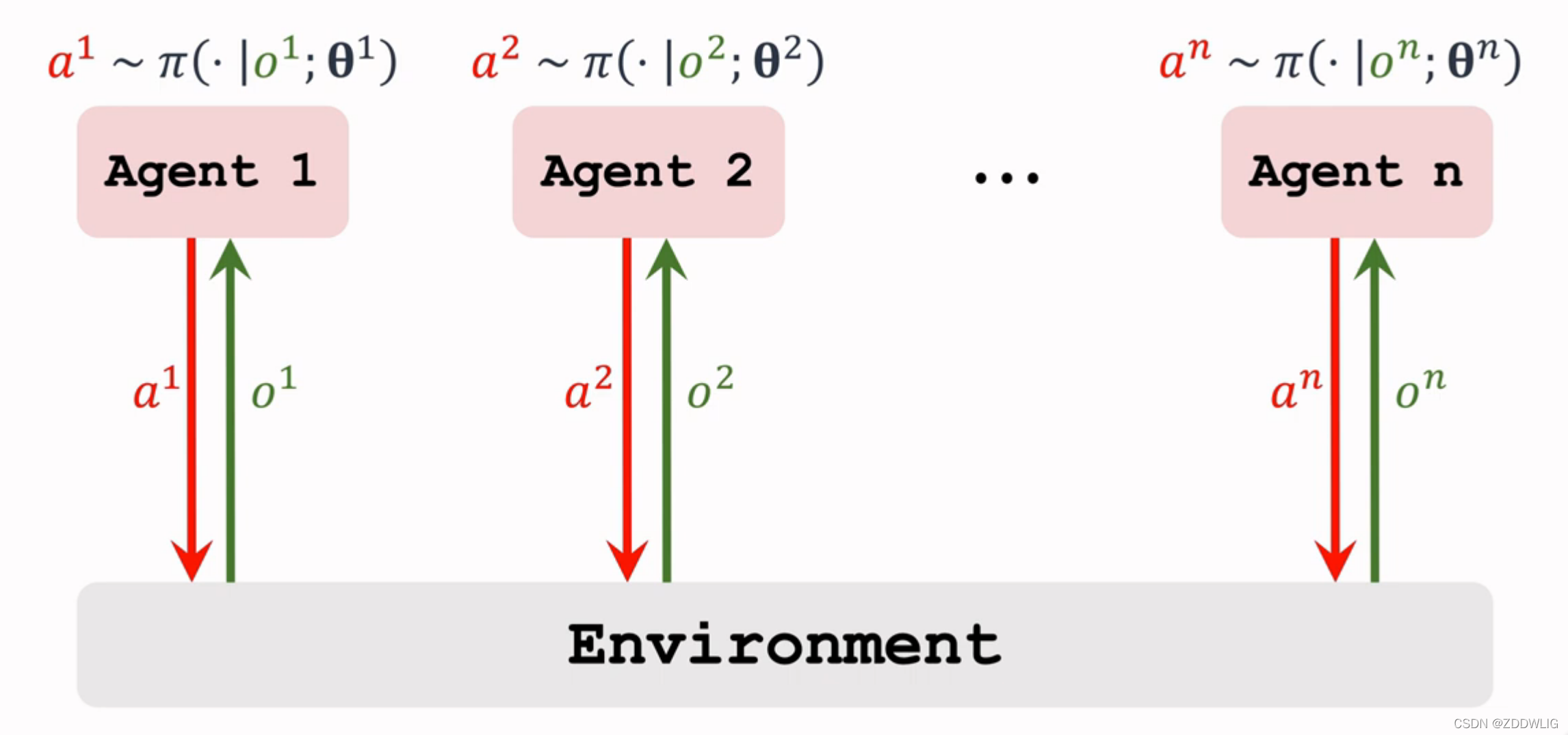 完全去中心化(Fully decentralized),这一种结构完全仿照Single-agent使用Actor-Critic方法进行训练,将多个智能体看出一个个单智能体,分别使用Actor-Critic方法,具体就是使用对于第 个agent,以