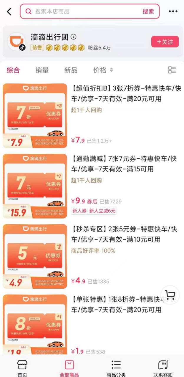 以账号「滴滴优惠券直播间」为例,其店铺「滴滴出行团」粉丝数达5.4万,已售商品数更是达17.6万,该账号主体名称为北京桔行科技有限公司,正是滴滴2020年在北京成立的子公司。