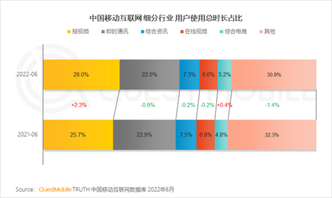 根据QuestMobile数据,2021年12月短视频行业月人均使用时长增长至53.2小时,超过即时通讯成为用户使用时长最长的行业,总时长占全网总时长比例达25.7%。2022年上半年,短视频用户总时长占中国移动互联网用户使用总时长占比的近三成 ( 28.0% )。
