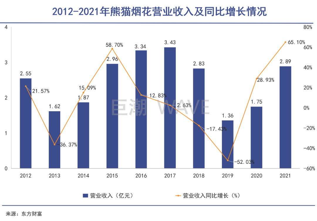 在这种一片“喊打”的大环境下,中国烟花产业整体发展实际上是较为缓慢的。以熊猫烟花为例,近十年来,企业起起伏伏,几乎没有任何发展。熊猫烟花方面曾向媒体表示,2019年春节期间,北京全市总销量是2.3万箱左右,而在2009年,这一数字是60万箱,十年间缩水九成以上。