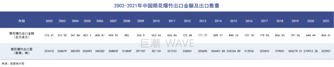 国家统计局的数据显示,2021年全国烟花、爆竹累计出口322901吨,金额累计8.05亿美元,分别同比增长19.2%和16.5%。亚洲、北美和许多西方国家是我国烟花爆竹产品主要的出口市场。