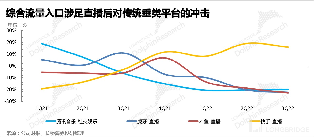2)大平台基于收入增长的焦虑,会凭借在流量综合入口上的碾压式优势,涉足一些进入门槛较低的领域(如直播),从而挤压了原有领域中垂类平台的生存空间。比如快手、B 站发力直播后对传统直播平台虎牙、斗鱼的影响。