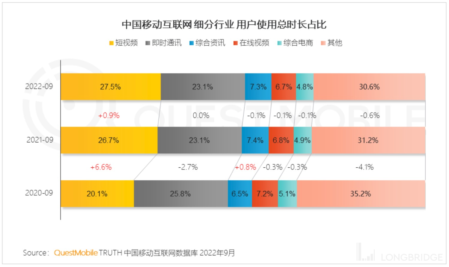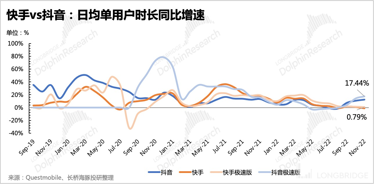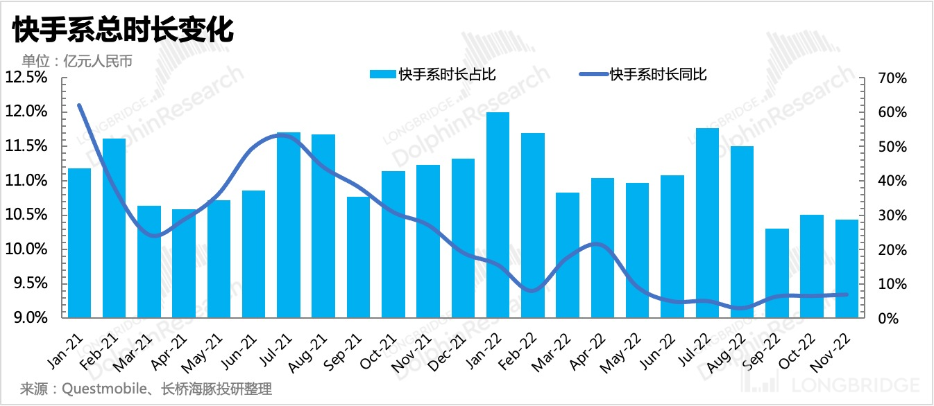 Questmobile 的数据显示,作为还处于红利期的纯短视频平台,快手去年的时长增速有点掉队,整体时长占比的份额并没有像字节一样保持稳定提升,而是停滞不前。
