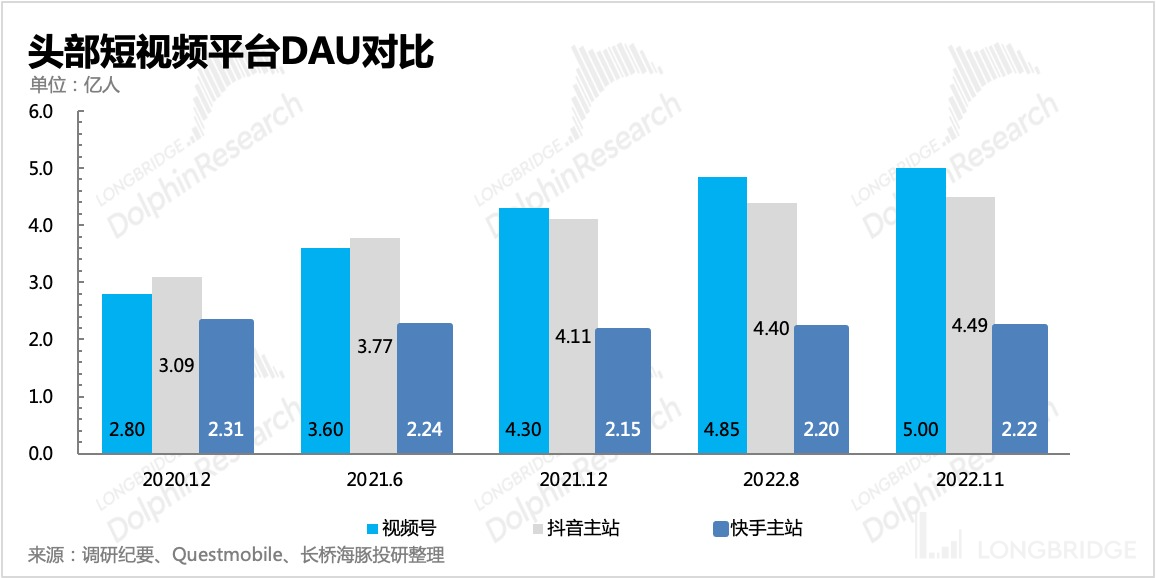 其中,对行业竞争格局影响最大的就是腾讯的视频号。公司管理层对视频号的资源倾斜力度、业绩目标明显超出了海豚君原先的预期。因此结合最新的一些调研数据,海豚君这里主要更新一下视频号的观点。