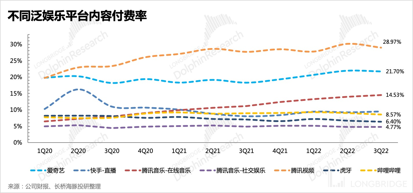 如果以长视频 20% 的付费率作为成熟内容付费平台的水平,那么数字音乐还有进一步提升的可能,而直播付费率普遍偏低,在监管和经济低迷下,付费率甚至持续下滑。因此在 2023 年松弛复苏的环境下,或许可以期待直播的付费率能够恢复至正常 10% 的水平,但由于不是独家的版权属性内容,直播付费率难以看齐数字音乐和长视频。