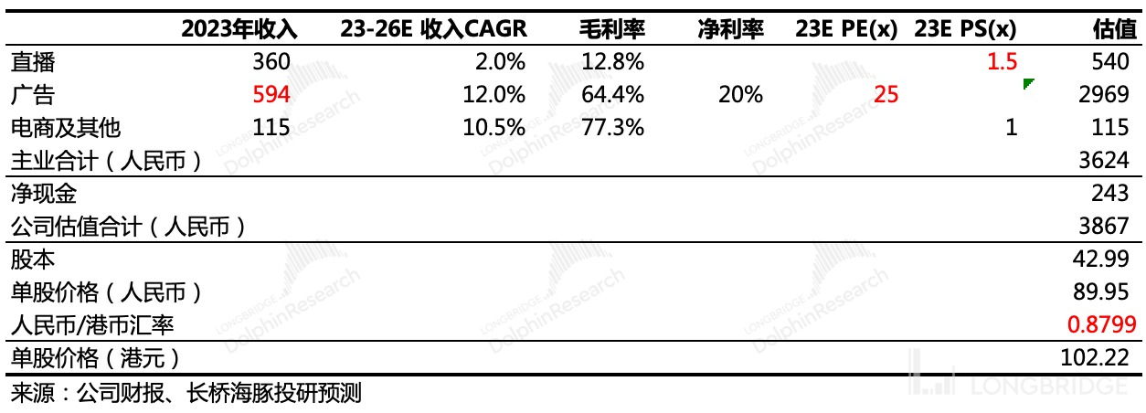 因此当同为私域属性更重的视频号在今年重点发力,倾全集团之力来扶持,无论是短视频信息流广告还是直播购物,在预期快手的市场份额时,很难去回避视频号的影响。因此我们略微调低了广告收入预期,同时和其他同行一样,为反映正常经营环境下的市场情绪,提高了直播业务、广告业务的估值倍数。