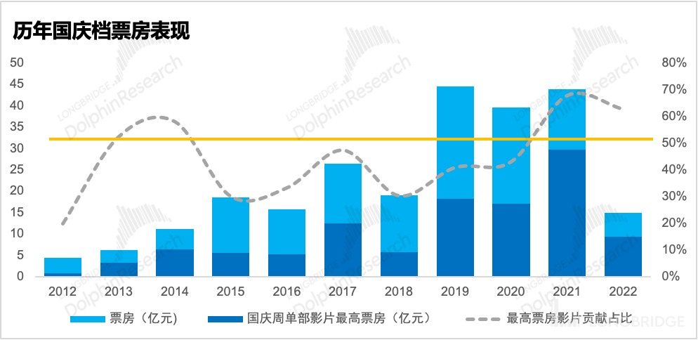对比历年的国庆档电影票房表现,2022 年国庆期间封控并不严重,但票房尤其惨淡且 TOP1 票房的影片占比过高,即供给端呈现出一种不健康的状态,内容供给对整体市场创收能力的影响可见一斑。