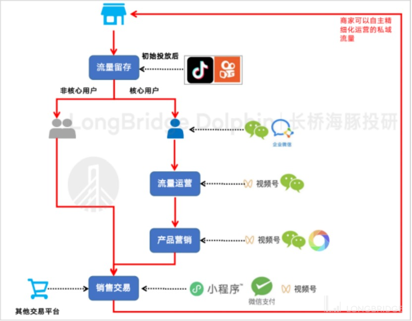 实际上,这和海豚君早在 2021 年中《流量产权战:商家入局,腾讯得意》畅想过的消费场景类似。只不过,商家原本需要从抖音、快手那里薅来的流量,在视频号的日活逼近 4 亿也掌握了一个重要的流量入口后,这样的 “外部买量” 费用也可以省掉一些了。