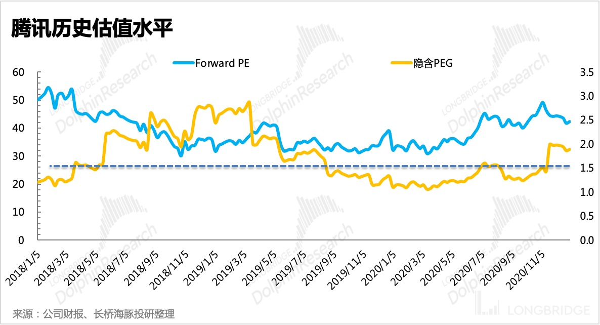 除了长期的历史估值中枢在 30-40x 区间外,如果分阶段看,在 2020-2021 年全市场大水漫灌之前,腾讯的估值水平一直与归母净利润的增长预期保持 PEG=1.5 的平衡关系,区间波动跨度较大,为 1~2。比如在 2017 年,经调整的归母净利润增速在 40-45% 左右,Forward PE 保持在 50x 以上,隐含的 PEG 为 1.25。