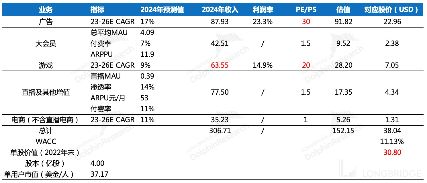 另一块社交娱乐收入,因为还在下行趋势中,为了留一些安全空间,我们假设后续稳定在 130 亿/年的规模,相比今年预计再下滑 15%。这样合计总营收 310 亿。