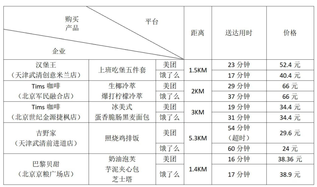 本次测试以北京、天津两地为测试地点,分别用美团和饿了么两个平台在同一时间、同一地址的店铺下了外卖订单,其中包含了Tims咖啡、吉野家、汉堡王、巴黎贝甜等连锁品牌。