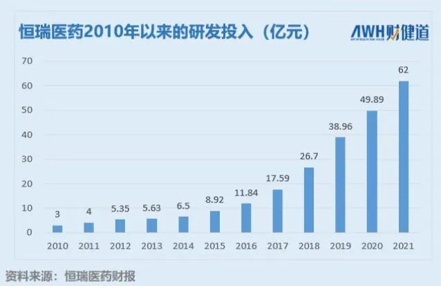 2021年,恒瑞研发投入超62亿元,以24%的增幅创下新高,仅次于百济神州的95亿元。但在2018年以前,这一数字不足20亿元,2012年以前则不到5亿元。