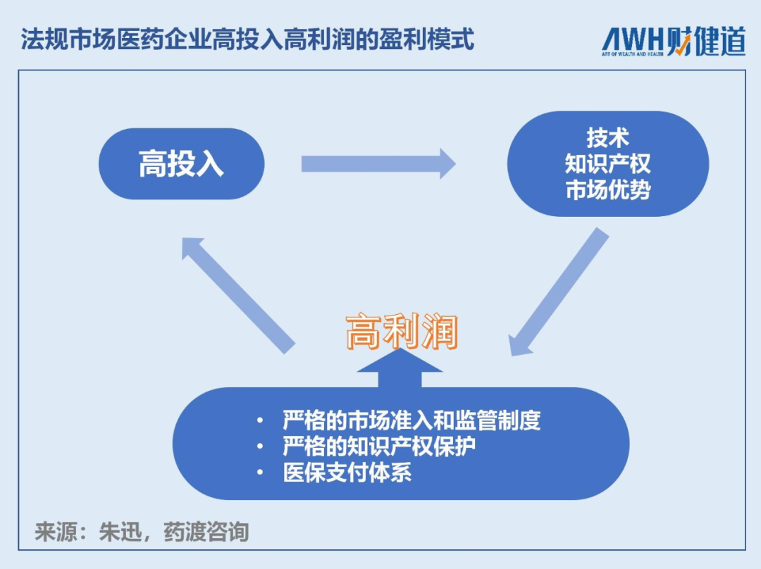 当然,在生物医药产业精细分工、默契合作的前提下,市场各方都能赚钱、“有肉吃”。在美国等国际法规市场,医药企业的盈利模式非常清楚,即高投入、高利润,以技术和知识产权建立市场优势。