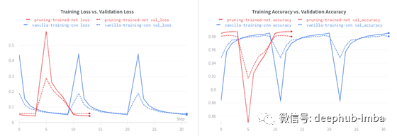 我们可以看到修剪模型不会损害性能。红线对应于修剪后的实验。