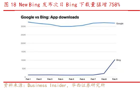 data.ai数据显示,新功能上线当日,必应Bing应用程序的全球下载量在一夜之间猛增十倍;截至3月10日,Bing活跃用户已突破1亿人,增幅超600%。