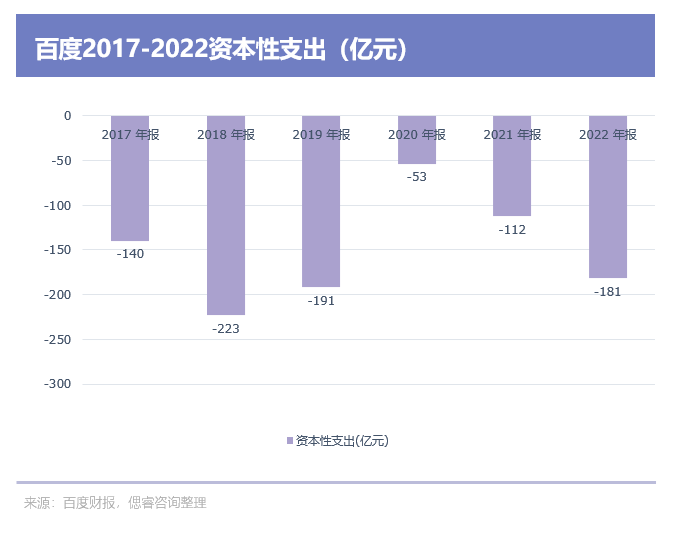 在2017年,百度提出“All IN AI”之后,百度持续为AI输血。在2022全年资本开支(除爱奇艺)高达181亿元。
