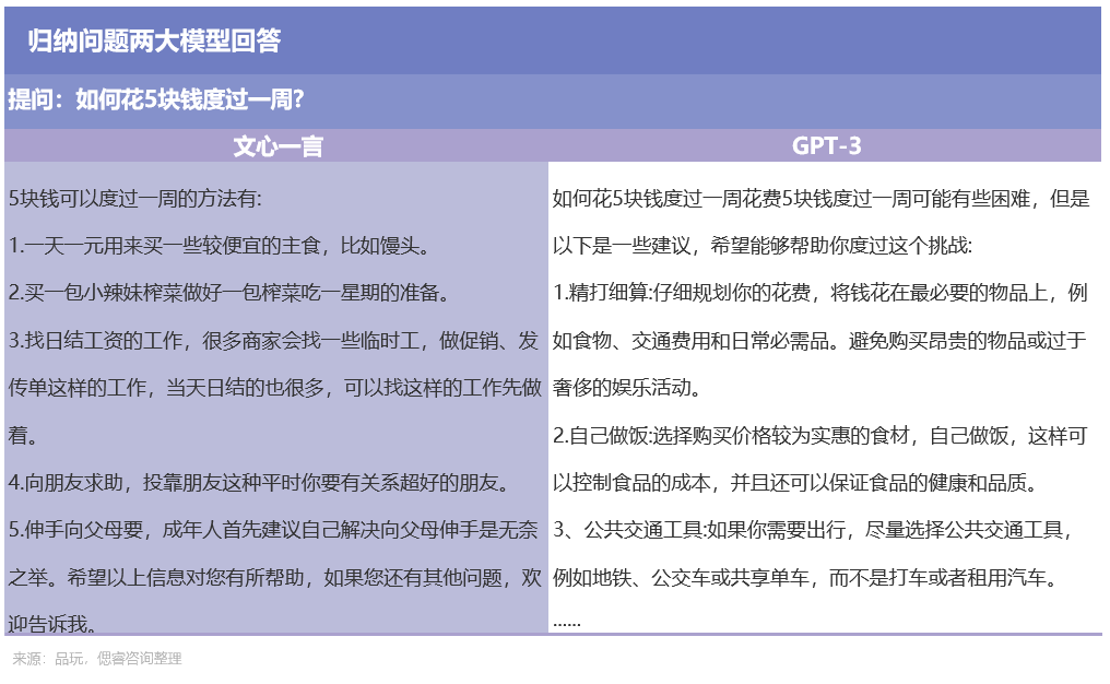 在归纳总结类任务中,文心一言表现较好。品玩让文心一言和GPT-3分别给出一个用 5 块钱度过一周的方案,文心一言、GPT-3的回答是: