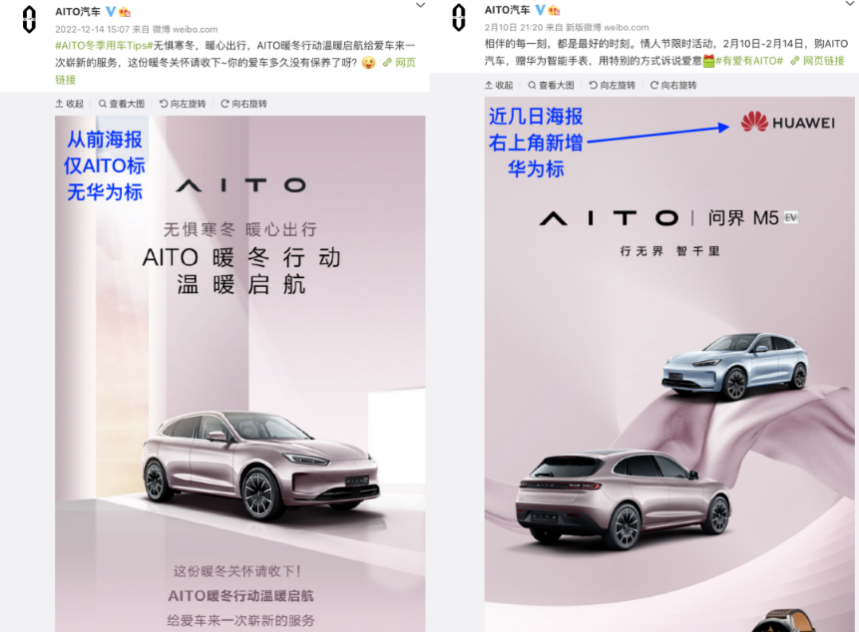 如今,问界甚至于打上了“华为”品牌。据“小白测评”等观察,开年过后,问界的宣传物料上,已打上了华为标了。