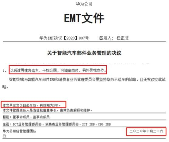 当时华为的口号是“华为不造车,而是聚焦ICT技术,帮车企造车”。此后,华为一直重申不亲自下场造车,甚至在2020年10月26日,在内部文件中写道“绝不造车,想造车的出列,自行离岗”,主动为自己套上“不造车”的“紧箍咒”。