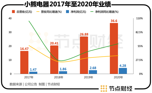 2017年至2020年,四年间,营收、净利润迎来持续高增长的小熊电器,在2021年突遭腰斩背后,更多是整个行业下滑所致。