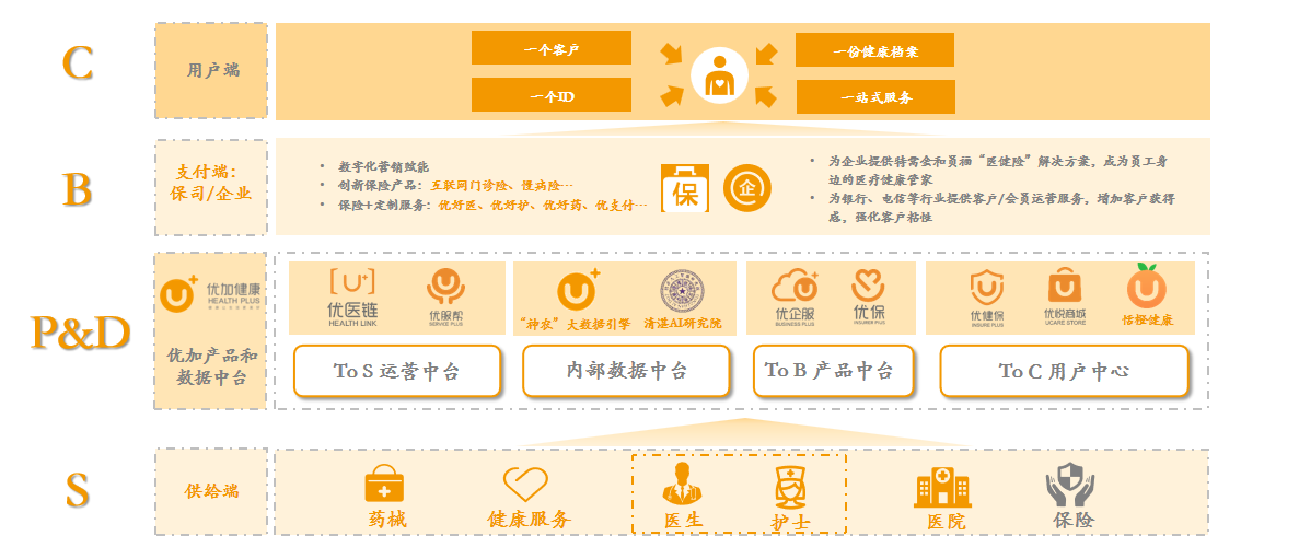 优加CHM(Cloud Health Management )管理系统,包含优企服、优医链、优服帮、优加健保、优悦商城和优保六大子系统,中间由智能大数据中台连接。面对S端,优服帮、优医链,通过“家医优护+优选医疗网络”的优势能力,赋能商保形成“保险+医疗”生态闭环;面对B端,优企服为保险机构及各类机构提供全方位健康管理的系统平台;面对C端,优加健保、优悦商城,为客户提供健康管理、疾病管理、康复管理、个性化健康管理服务,满足用户一站式健康管理需求;面对A端,优加拟建优保系统,供保险代理人购买、分销、获客及客户运营。