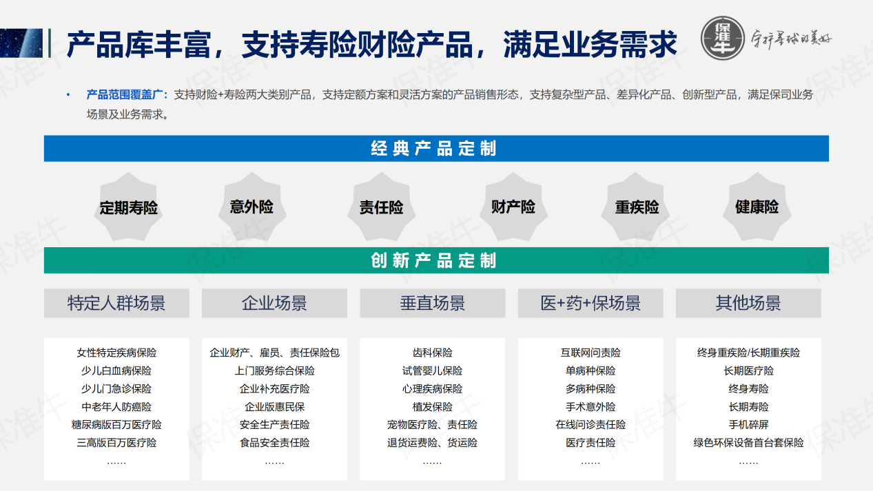 保准牛是一家以保险科技与数据驱动的专业化保险定制平台,依托先进的大数据和人工智能技术,通过数据化算法和产品模型形成动态迭代的反馈闭环,为多行业多场景提供保险定制服务。