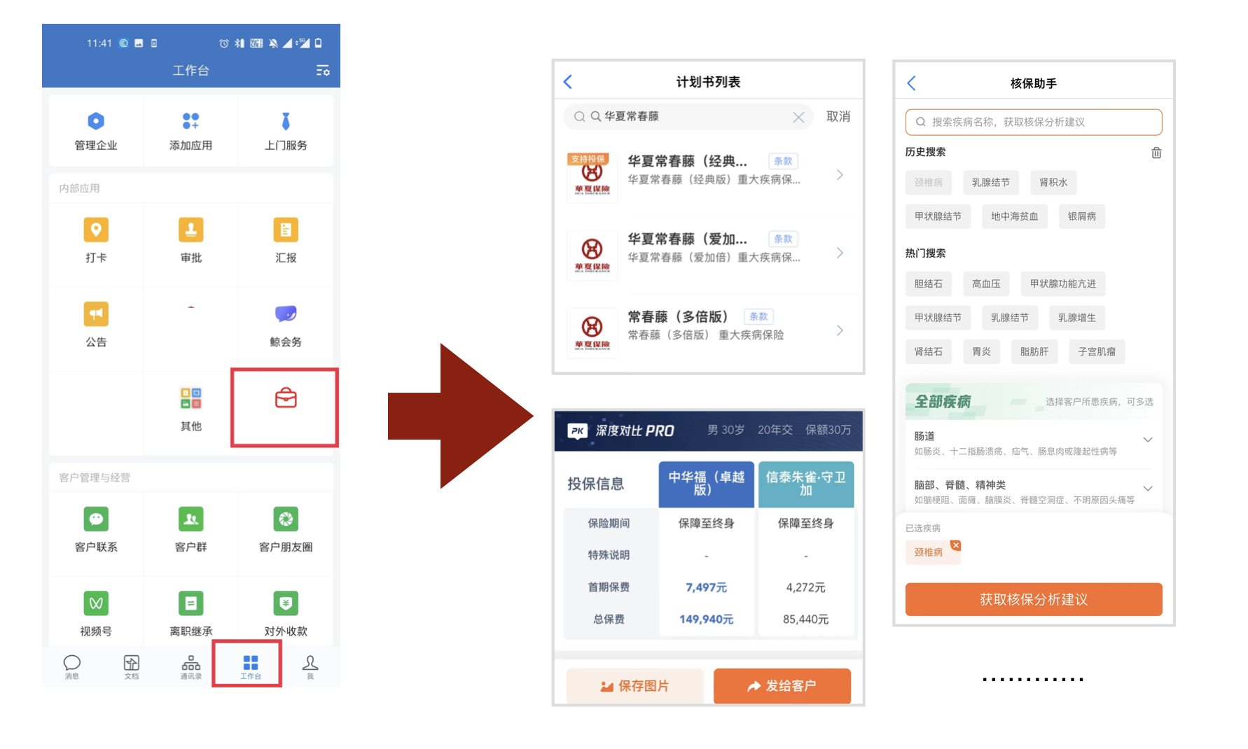 1、基于企业微信端(为入口),为客户搭建全流程保险展业工作台,整合包括智能计划书、产品对比、智能核保及其他展业辅助工具(保险知识百科、职业类别、条款查询等)。