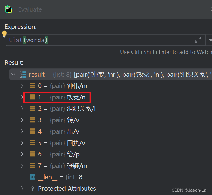 进一步佐证一下,debug一下,看看所有识别出的词语以及词性是什么