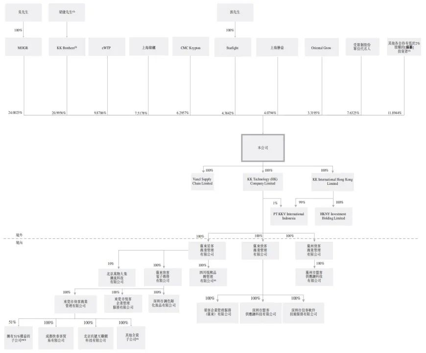 兄弟助阵之外,KK集团还有一票明星股东。IPO前,现任阿里本地生活CEO俞永福通过eWTP持股9.88%,上海纬砺持股7.52%,CMC持股6.29%,上海翀益持股4.08%,京东旗下的JDAngara持股1.38%。