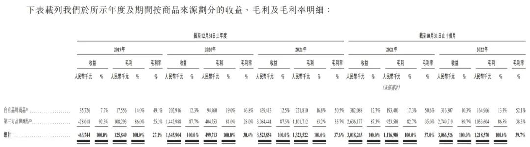 好消息是,业务快速扩张之下,其毛利以及毛利率也在不断增长。报告期内,其整体毛利率分别为27.1%、30.4%、37.6%、39.7%,逐年递增。具体来看,毛利率相对较低的第三方品牌贡献了绝大多数的毛利,但第三方品牌商品的毛利率逐年走高。