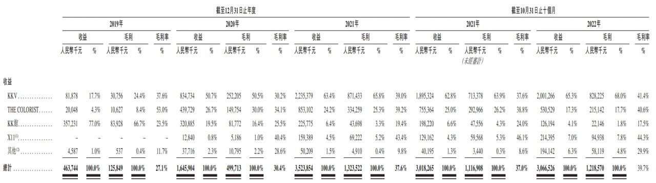 KK集团的收益主要来自货品销售以及基于销售的管理及咨询服务收入。2019年-2022年10月,KK集团营业收入分别为4.64亿元、16.46亿元、35.23亿元、30.67亿元。