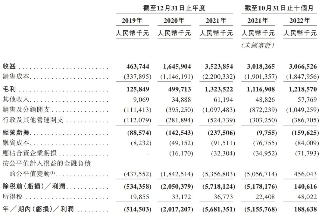 乐居财经《穿透IPO》发现,2019-2022年前10月,“按公平值计入损益的金融负债的公平值变动”分别为-4.38亿元、-18.43亿元、-53.57亿元以及4.56亿元。
