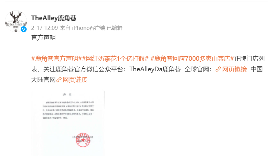 鹿角巷官方声明,图/鹿角巷微博官微