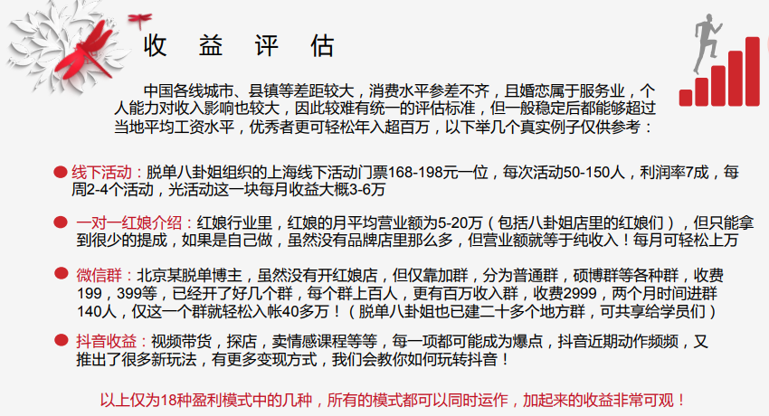 这位主播表示,“红娘”和相亲账号的盈利,主要来源于线下活动入场费、一对一服务介绍费以及抖音流量变现收入,“我不能保证学员的收入水平,能‘吃下’多少资源取决于红娘个人水平。”