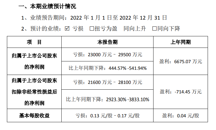 露笑科技发布的2022年年度业绩预告显示,公司归属净利润亏损2.3亿元–2.95亿元,较上年同比下降444.57%-541.94%;扣非归属净利润2.16亿元–2.81亿元,同比下降2923.3%-3833.1%。