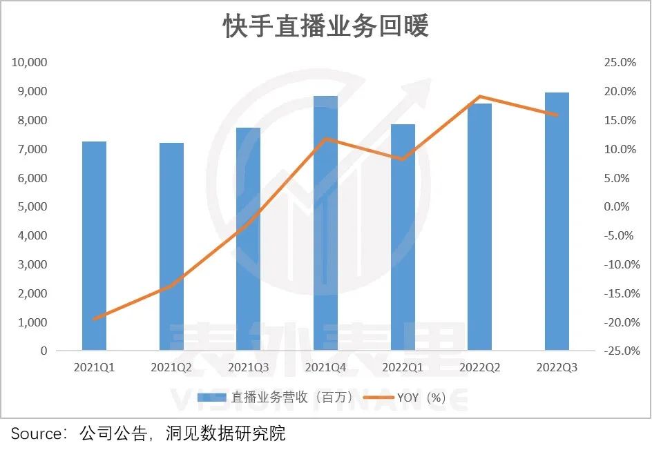 内容创作者受限,内容消费者粘性稀释下,快手上市前后的几个季度直播业务持续下滑。